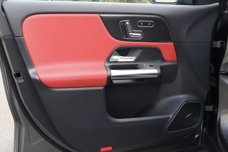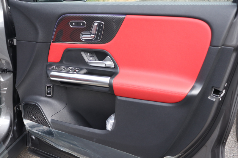 インテリアは本革シート(クラシックレッド/ブラック)を中心に、スポーティで上質な空間に仕上げられています。AMGパフォーマンスシートやAMGパフォーマンスステアリング(ナッパレザー/DINAMICA)、カーボン調インテリアトリムがAMGらしい世界観を演出。さらにシートベンチレーター・シートヒーター・ヘッドアップディスプレイ・パノラミックスライディングルーフなど快適装備も充実。